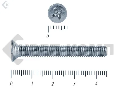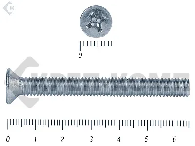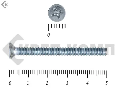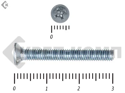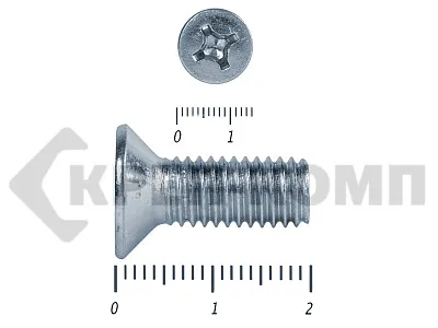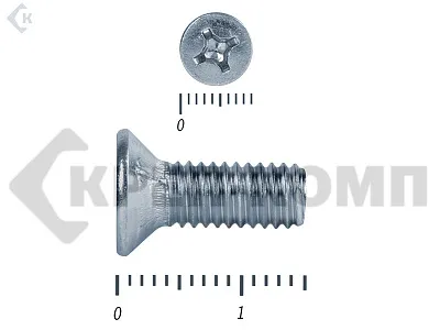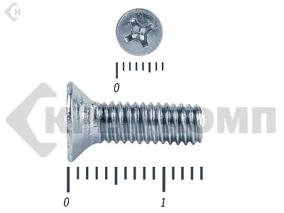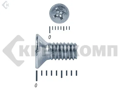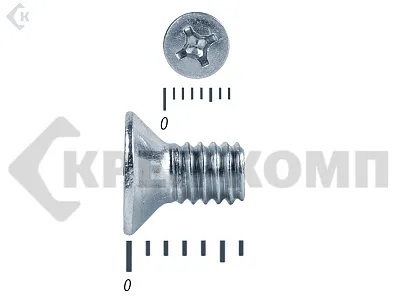 Винт с потайной головкой DIN 965, (ГОСТ 17475), оцинкованный, класс прочности 5.8. Шляпка при монтаже глубоко утапливается в материале и не выпирает наружу. Винт DIN 965 с потайной головкой с крестообразным шлицем и полной резьбой (метрической стандартного шага, нарезанной по всей длине шпильки). Винты DIN 965 используются в строительстве, машиностроении, промышленных и производственных отраслях совместно с шайбами, гайками соответствующих размеров